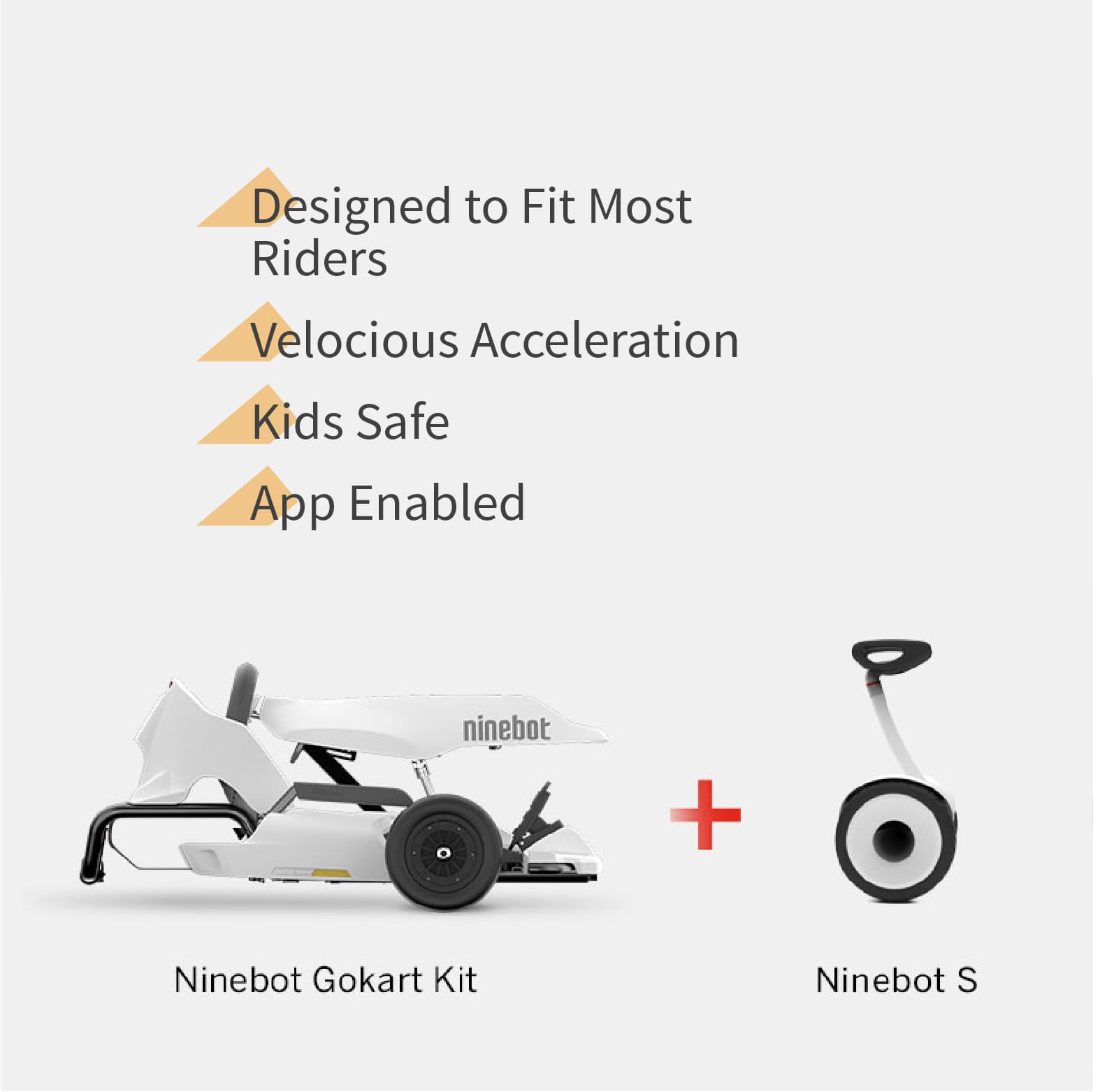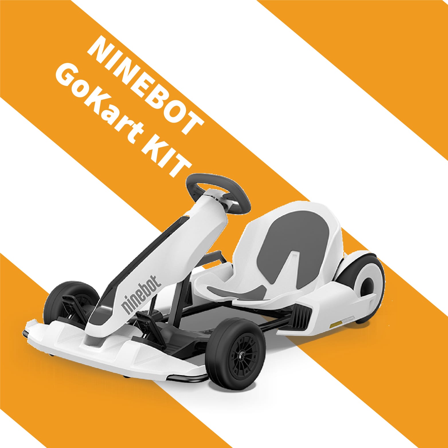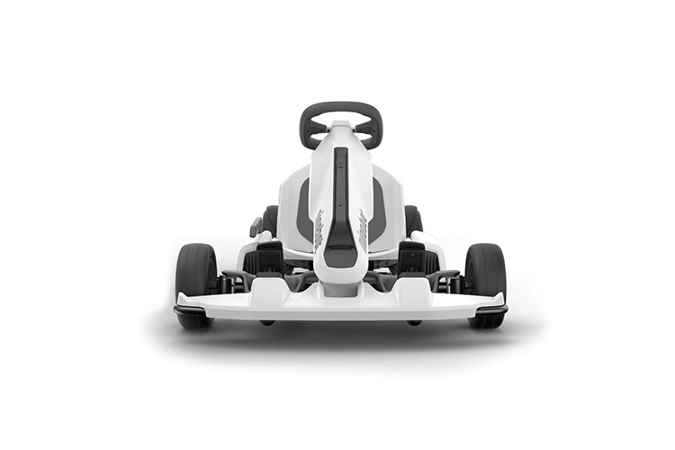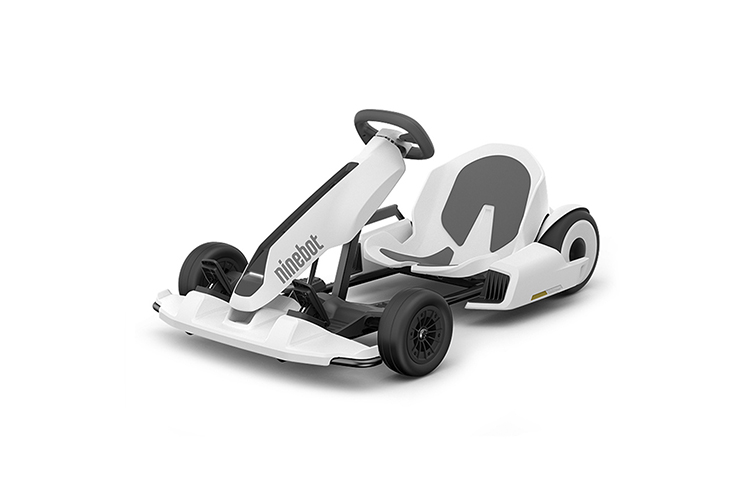 The Ninebot Electric Gokart comes with the Gokart Kit and a Mini S. The Gokart Kit contains a steering wheel, seat, front bumper, and front wheels. The Gokart Kit is fitted over the Mini S, which functions as the rear wheels and powertrain for the Gokart.