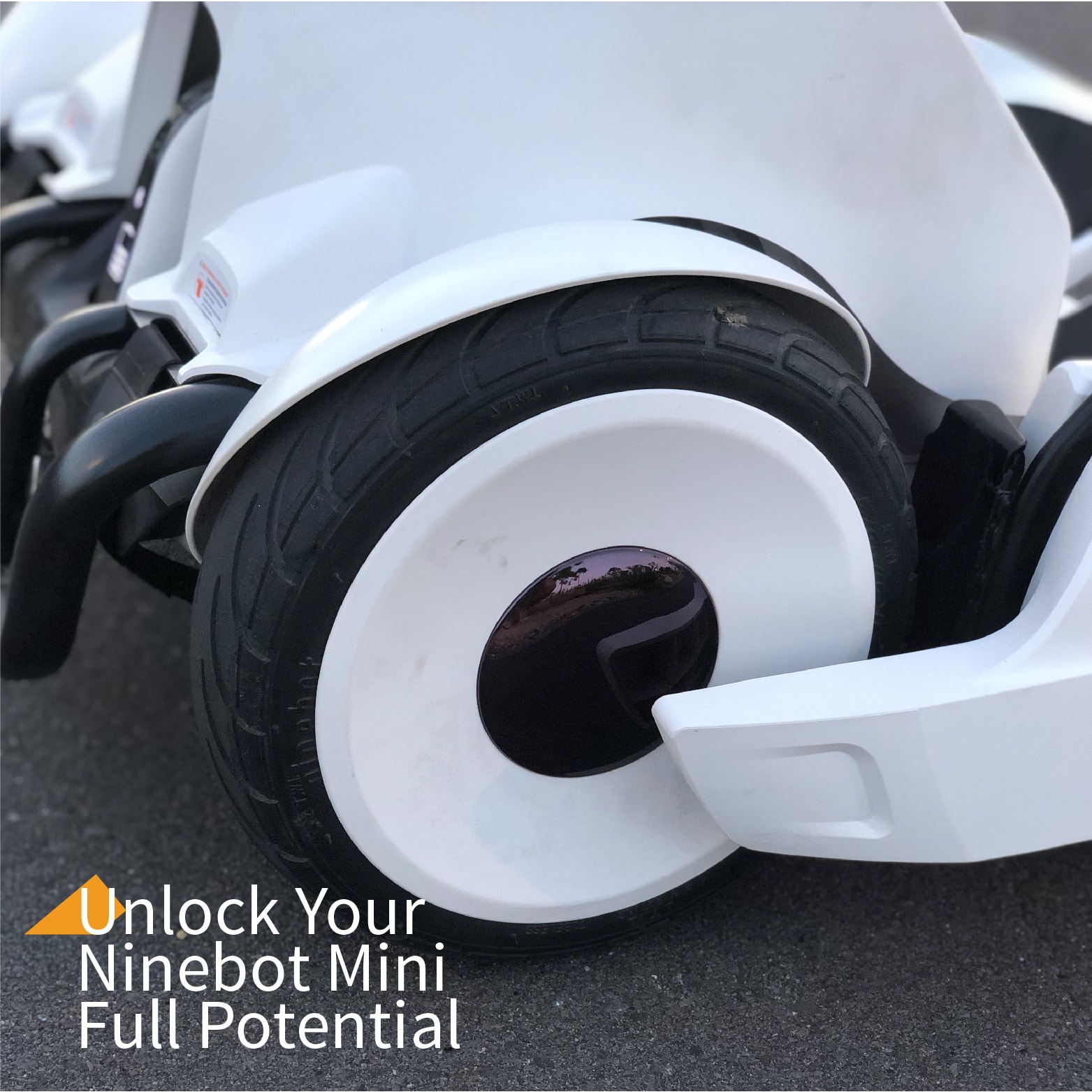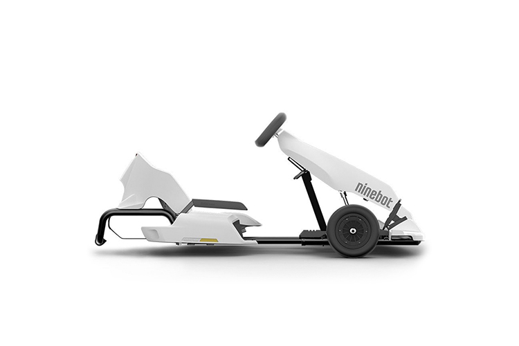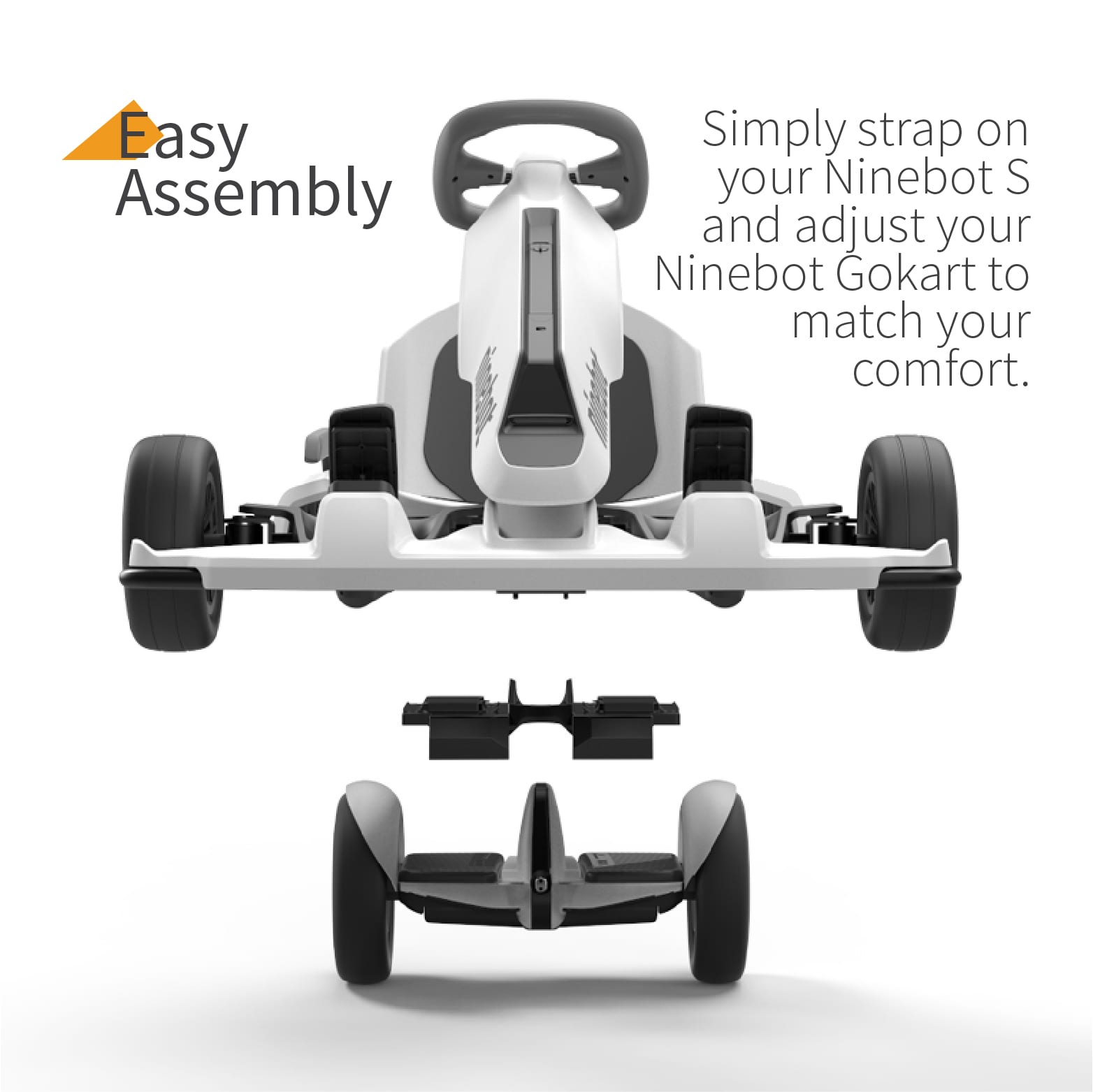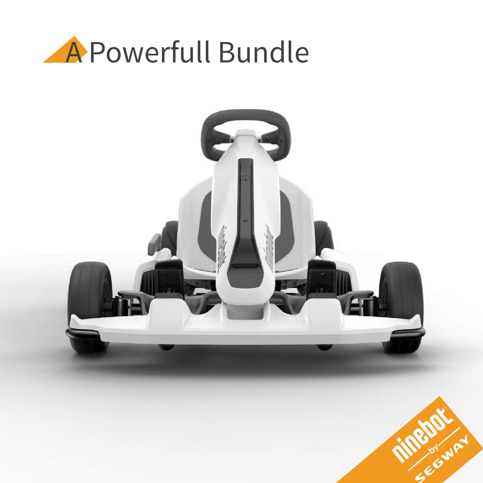 The Ninebot Electric Gokart comes with the Gokart Kit and a Mini S. The Gokart Kit contains a steering wheel, seat, front bumper, and front wheels. The Gokart Kit is fitted over the Mini S, which functions as the rear wheels and powertrain for the Gokart.