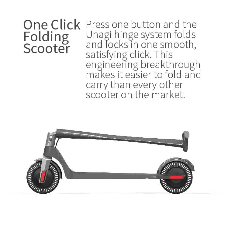 Press one button and the Unagi patented stainless steel hinge system folds and locks in one smooth, satisfying click. This engineering breakthrough makes it dramatically easier to fold and carry than every other scooter on the market. We know because we tested them.