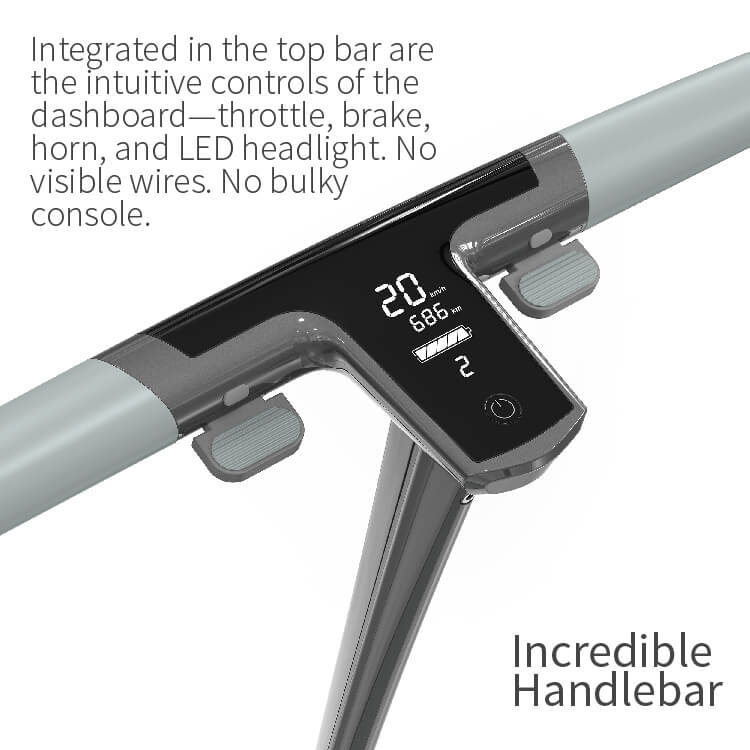 The magnesium alloy handlebar is a feat of structural engineering that required more than thirty prototypes to perfect. Integrated in the top bar are the intuitive controls of the dashboard—throttle, brake, horn, and LED headlight. No visible wires. No bulky console. Just a sleek, integrated command center that connects the rider to the ride. Why Magnesium? It’s 33% lighter than aluminum, which partially explains why the Unagi is the most portable scooter on the market.