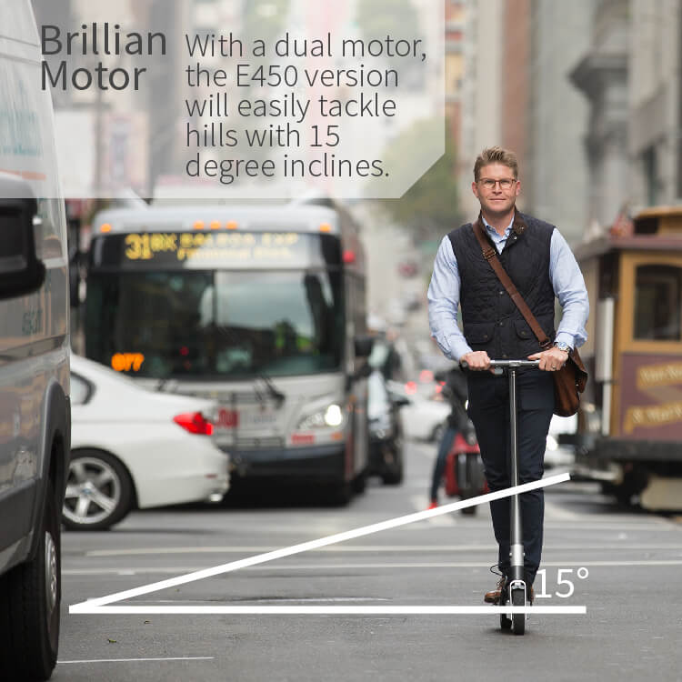 You have two choices: The E250 contains a robust 250-watt motor embedded in the front wheel, and is ideal for riders whose typical ride is flat urban terrain. The E500 has a dedicated 250 watt motor in each wheel, supplying 500 watts and over 28 newton meters of torque so you can easily tackle hills with 15-degree inclines. Our motors are completely custom built utilizing rare-earth neodymium magnets and a monitoring system to ensure no overheating. It’s been painstakingly optimized for performance, efficiency, responsiveness, and longevity.