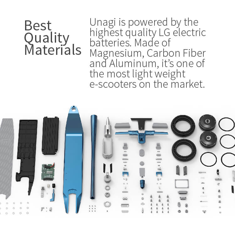 Unagi leverages TORAY carbon fiber from Japan to strike an unprecedented balance of lightweight and heavy-duty strength. The composite is anisotropic, a technical term meaning it’s laid down by hand in a painstaking process that optimizes strength by distributing layers of the fiber where it’s needed most. You don’t have to tell your friends that your scooter uses the same carbon fiber as Elon Musk’s Space-X rockets, but we can’t blame you if you did.